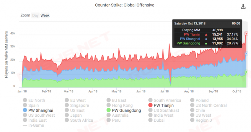 通过进一步筛选,上图为CSGO国服的上海、广东和天津三个服务器群组的每日玩家人数,可以看到,在2018年内,CSGO国服的整体玩家人数在慢慢增长。考虑到部分国内玩家只玩国际服或是对战平台、社区服等,相信国内玩家人数更多,虽然无法获得准确数据。