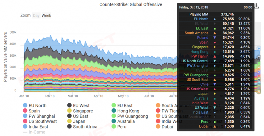 图中显示了2018年内CSGO官方各个地区匹配服务器玩家人数,不包括社区服、对战平台,可以看到,玩家人数最多的是欧洲服务器。