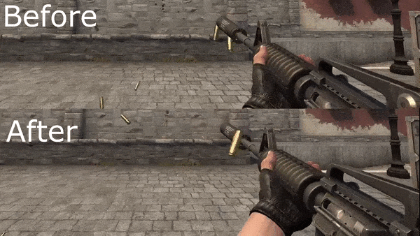 Zool一直在研究解决武器射击时错误的子弹壳抛出位置,由于CSGO默认子弹壳抛出是往右边,而在CSCO中虽然子弹壳可以向左边抛出,但却是在武器模型后,不过这个问题总算得到解决。