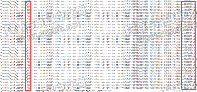 如上图,从编号901到930是九头蛇大行动的任务描述,静谧雪村、运输货船等均为九头蛇大行动地图,以编号930为例,具体的任务描述为:
