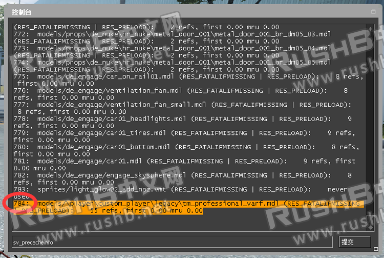 接下来,我们需要达里尔爵士模型在本地图的生成编号,控制台输入:sv_precacheinfo