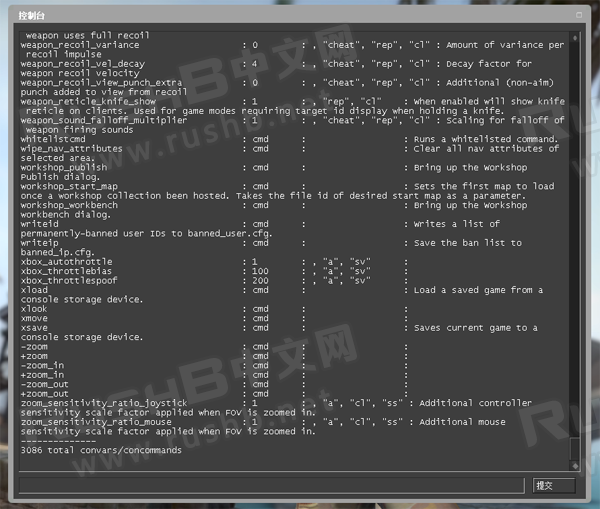 然后控制台会加载出所有CSGO指令列表,并且在底部注明:3086 total convars/concommands,即3086条指令。