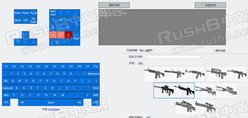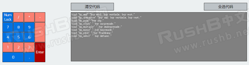 进入页面后,可以看到左边为键盘各个按键,玩家可以使用这些按键编辑一键买枪脚本;右上一款为代码栏,编辑好的代码会在这里显示;右下为各个主武器、手枪、投掷物手雷和护甲装备,方便玩家选择。