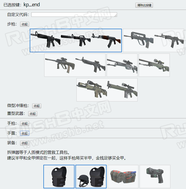 我们可以为每个按键编辑要购买的武器以及装备、投掷物,没错,,一个按键可同时编辑购买主武器、手枪和多个手雷、装备,比如购买大枪时,同时购买全甲。