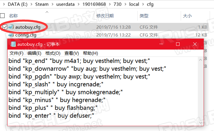 在cfg文件夹中,新建文本文档并打开,将之前做好的一键购买代码粘贴到其中,保存,然后将文档重命名为autobuy.cfg,注意windows系统要先设置才能修改文件后缀,autobuy.cfg文件如图: