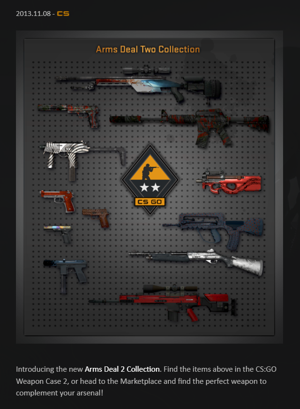 反恐精英武器箱于2013年8月14日更新,当时V社还推出了多款地图收藏品、皮肤掉落、消音M4A1和USP、暗金计数功能,以及市场、交易功能,所以反恐精英武器箱内包含的皮肤也归类为军火交易收藏品。