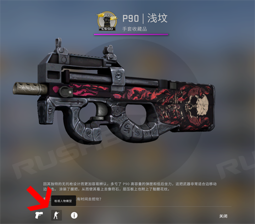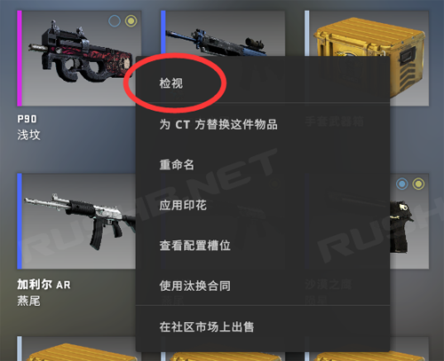 打开游戏的库存界面,选择要替换的武器皮肤(除电击枪外,包括C4、匕首等武器均可装备显示在主界面),点击“检视”。