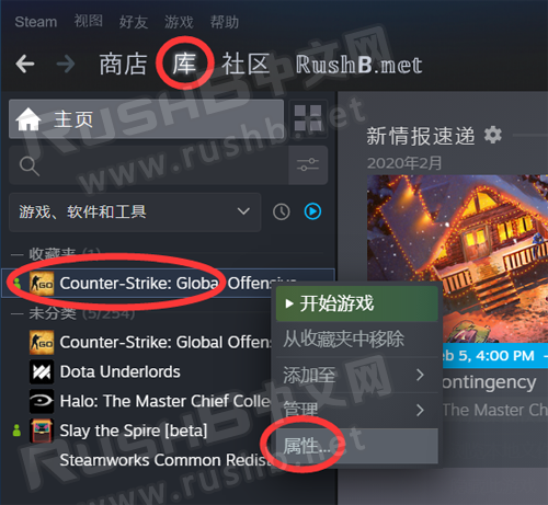 打开Steam客户端——点击“库”——在左边的游戏列表找到CSGO,右键——点击“属性”,如图: