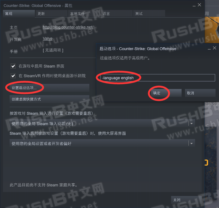 然后在CSGO属性窗口中,点击“设置启动选项”——在新弹出的启动选项窗口中输入“-language english”——点击“确定”,之后重启游戏即是英文语言,其他语言包括繁简中文等启动项请看本文下方。