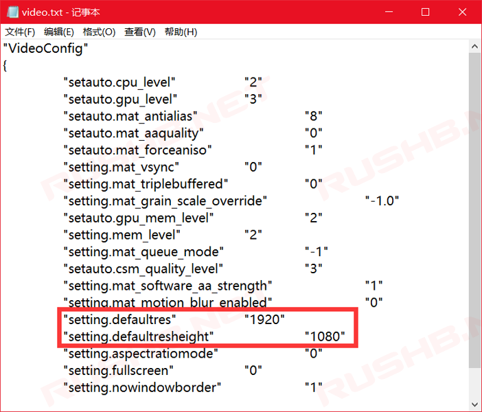 打开其中的视频设置文件“video.txt”,将其中的”setting.defaultres”(宽)和”setting.defaultresheight”(高)后的数值改成需要的分辨率,然后保存TXT文件,之后启动游戏就是设置好的分辨率了。