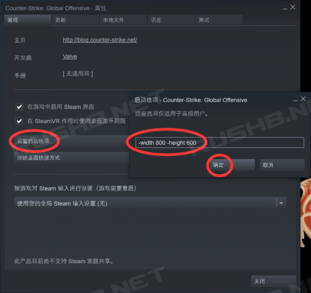 另外一种是通过设置启动项修改分辨率,打开“Steam客户端——库”,找到CSGO,右键属性,然后在“设置启动选项”里输入“-width 宽数值 -height 高数值”,例如“-width 800 -height 600”,设置完成后点击确定,启动游戏就是设置的分辨率了。