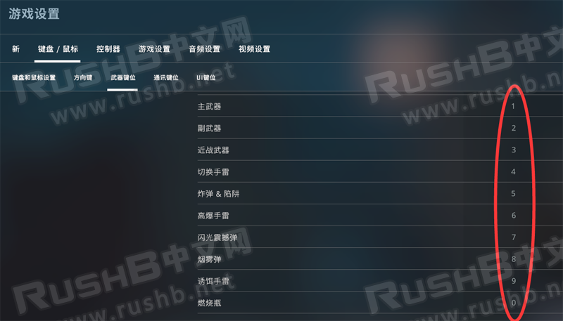 下图为CSGO默认武器键位,从“1”“2”“3”……至“0”