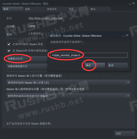 在属性窗口中点击“设置启动选项”,然后再输入“+triple_monitor_mode 0”,点击确定,之后启动游戏就正常显示了。