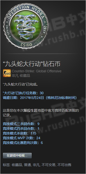 在库存界面,大行动挑战币会显示玩家完成的任务数以及参与时间,在九头蛇之前的大行动,挑战币会还会记录玩家在活动期间的官匹表现。