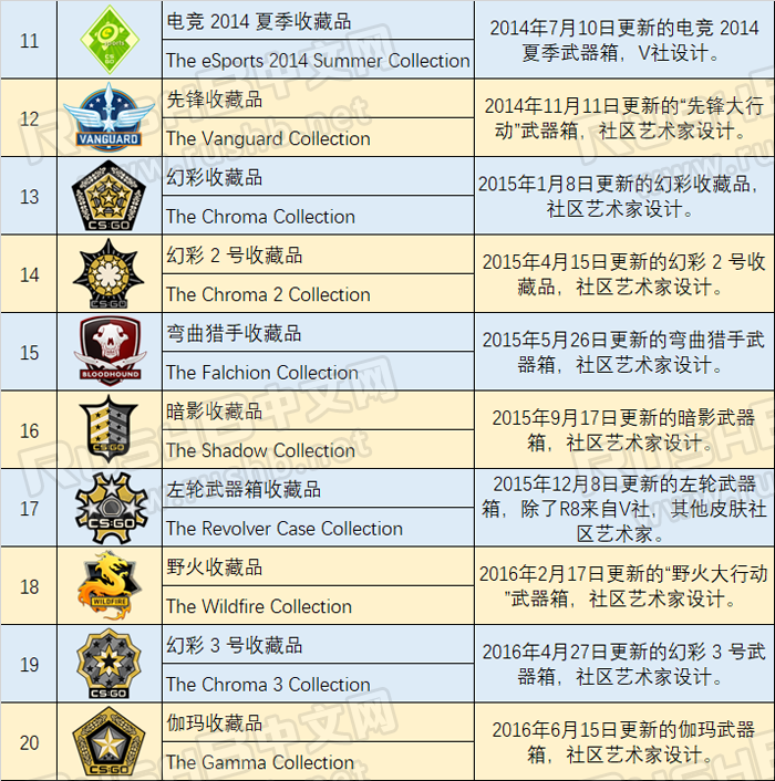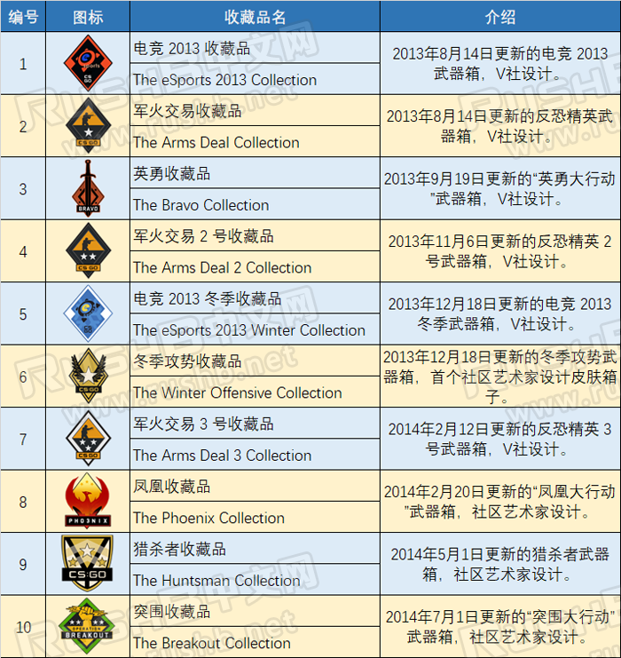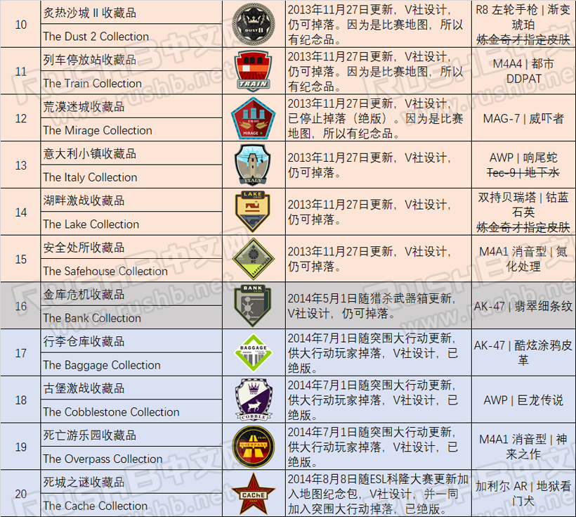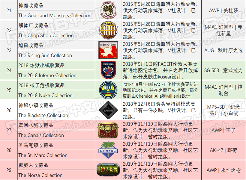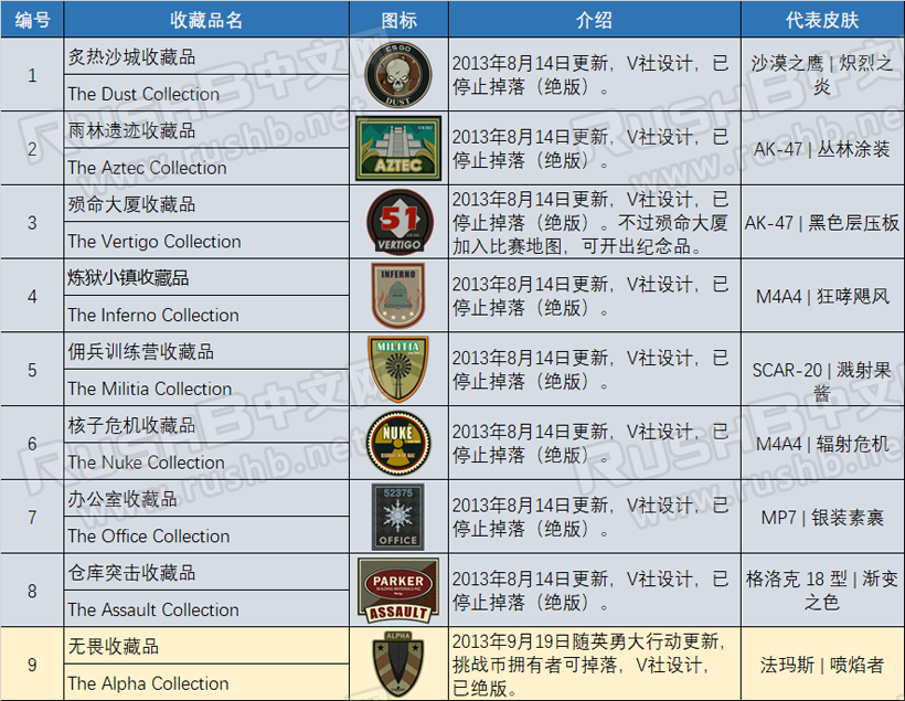 最早的炙热沙城、雨林遗迹、殒命大厦、炼狱小镇、佣兵训练营、核子危机、办公室、仓库突击收藏品只开放了几个月时间掉落便绝版,所以价格高昂。