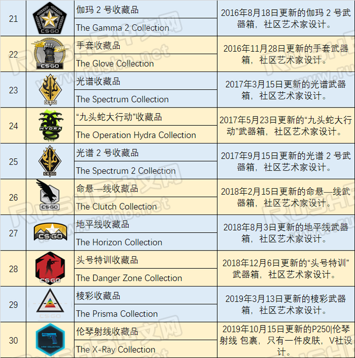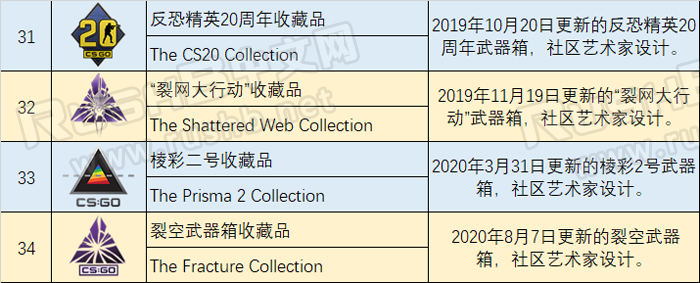 至今为止,V社官方一共推出了34个武器箱,包括一个特殊的P250|伦琴射线 包裹,每种箱子对应一个收藏品。早期箱子(黑色武器箱和电竞武器箱)中的皮肤来自V社自己设计,后面的黄箱子基本都是创意工坊采纳的皮肤。