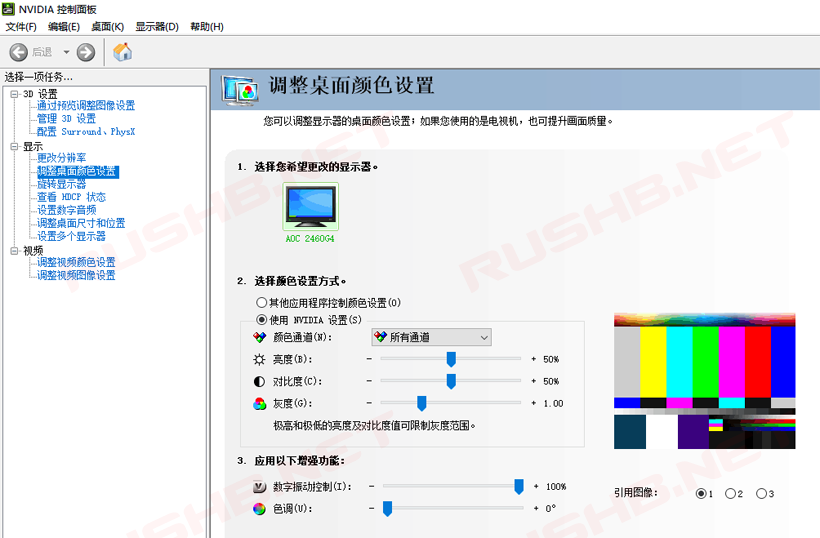 打开NVIDIA控制面板,“显示”——“调整桌面颜色设置”,将“数字振动控制”拉到“100%”,然后点击“应用”按钮,完成。