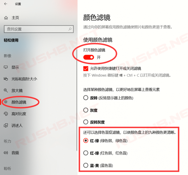 打开Windows设置——“轻松使用”,左边栏选择“颜色滤镜”,打开“颜色滤镜”功能,按自身情况选择“色盲症滤镜”。