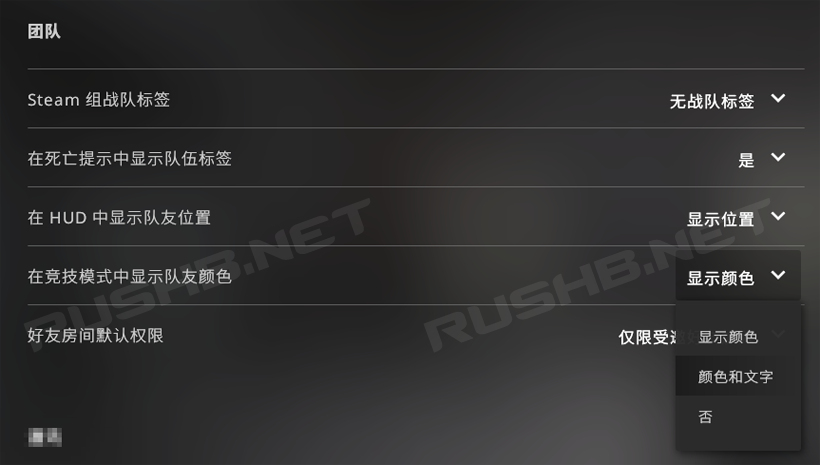 这样,雷达上的队友位置、记分板头像以及对话框都会显示颜色首字母,方便色盲玩家识别。