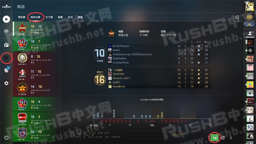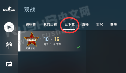 下载完成后,在“观看匹配比赛和锦标赛”——“已下载”便可查看保存的比赛DEMO,点击右下角的“观战”即可回放比赛DEMO。
