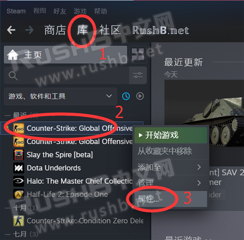 打开Steam客户端——库——找到CSGO——右键点击“属性”