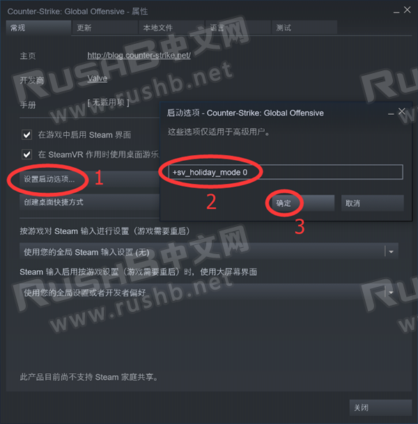 在属性窗口中,点击“设置启动选项”,然后在启动选项窗口中输入“+sv_holiday_mode 0”,再点击确定,如图: