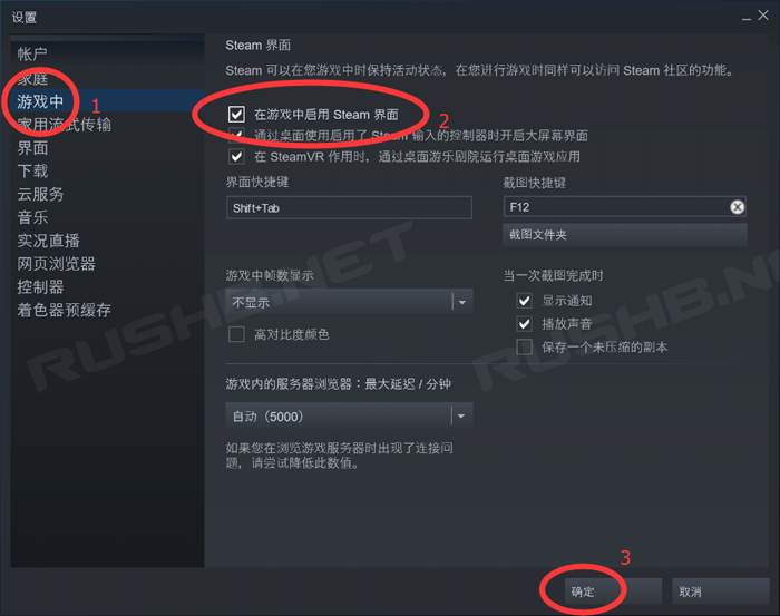 如果是设置问题,那么只要重新设置即可,打开Steam客户端,点击左上角“Steam”,然后点击“设置”,在设置窗口界面,点击“游戏中”栏,然后勾选“在游戏中启用Steam界面”,点击确定保存设置,之后重启游戏就可以正常购买付款了。