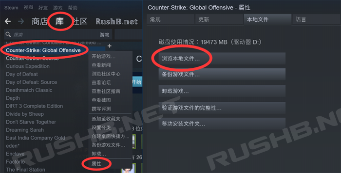 不知道路径的玩家可以在Steam客户端—库—CSGO右键属性,然后在属性窗口“本地文件”栏点击“浏览本地文件”