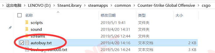 之后便会打开Counter-Strike Global Offensive文件夹,双击进入其中的csgo文件夹,找到autobuy.txt并打开: