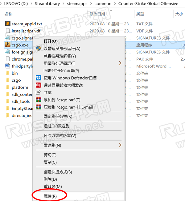 然后会打开CSGO游戏根目录文件夹,找到csgo.exe,右键点击属性,如图: