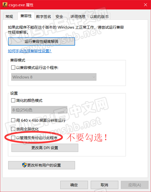 接着会打开windows系统的CSGO属性窗口——兼容性——不要勾选“以管理员身份运行此程序”,注意时是不要勾选,如图: