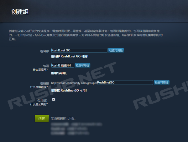 新建组方法:打开Steam组列表页面(https://steamcommunity.com/my/groups/),点击左下角的创建组,如图。其中的“缩写”是游戏内显示的组名,填写你要的文本,另外还要注意,“缩写”即显示组名确认后不要随意更改,如果更改后不会马上在游戏内显示,可能需要等待1、2小时。