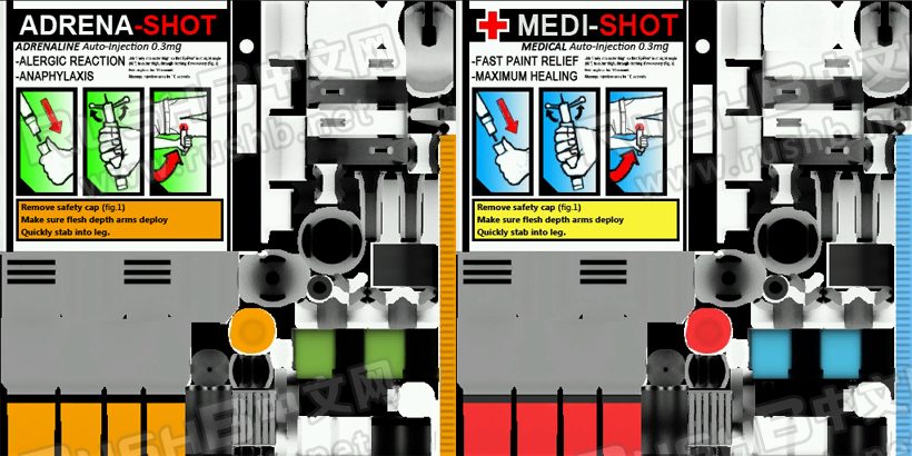 其实CSGO的医疗针其实就是求生之路2的肾上腺素,模型一样,只是修改了贴图部分细节和颜色,感叹V社的“环保意识”。让人吐槽的是,医疗针贴图上注明的使用方法是扎在大腿上,然而CSGO却是扎在胸前。