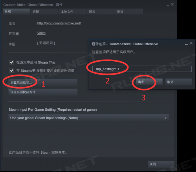 首先,我们需要添加CSGO启动项,打开“Steam客户端——库”,找到CSGO,右键属性,然后在“设置启动选项”里输入“+mp_flashlight 1”,点击确定。