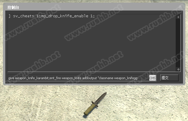 然后你就会发现按“G”键可以扔掉手中的默认匕首,然后继续在控制台分别输入以下指令,就可以获得对应的刀子: