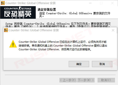 Counter-Strike:Global Offensive已经在此计算机上运行,必须先关闭才能继续安装。单击通知托盘上的Counter-Strike:Global Offensive图标以退出Counter-Strike:Global Offensive,然后再次运行此安装程序。