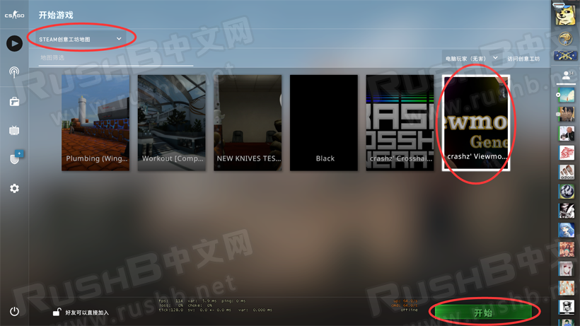开始游戏——选择“Steam创意工坊地图”——选择“crashz’ Viewmodel Generator”地图,点击“开始”按钮,然后自定义模式开始进入地图。