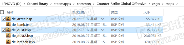 将创意工坊或网盘下载的“de_aztec.bsp”和“de_dust.bsp”两个文件移动到CSGO客户端map路径: