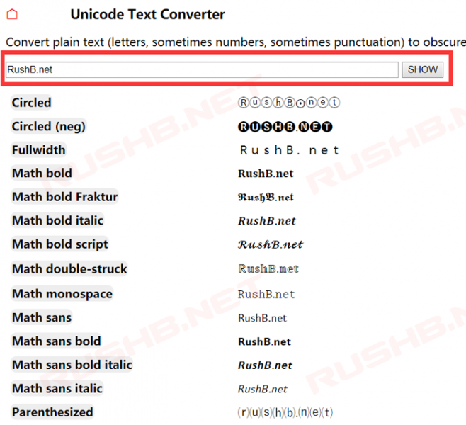 将输入框内的文本替换成你想要替换的文本,点击右边的“SHOW”确定,然后下方就会显示包括粗体/斜体等各种特殊字体的转换文本,供玩家多个选择。