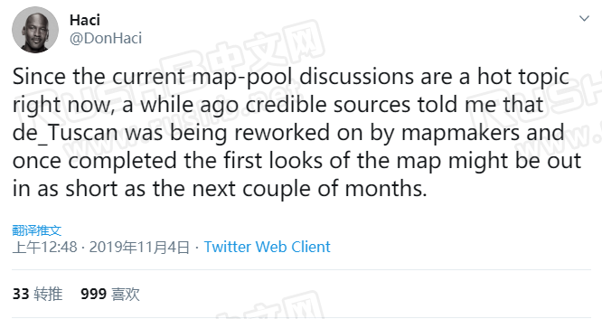 知名CSGO玩家DonHaci发推:当前的服役地图池是个热门的讨论话题,在不久前,有可靠人士告诉我,地图作者正在对de_Tuscan进行修改,一旦完成,将在几个月内亮相。
