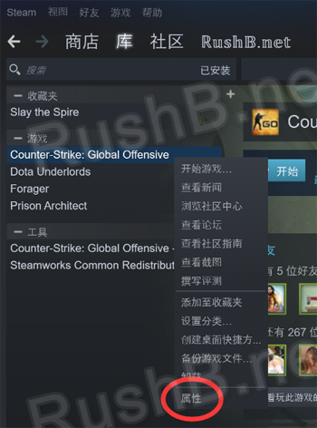 接下来,打开Steam客户端——库,找到CSGO并右键,点击“属性”