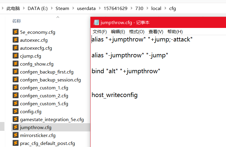 保存后关闭,然后将文本文件重命名为“jumpthrow.cfg”,注意,如果你的电脑系统没有显示文件后缀,请先设置再重命名。