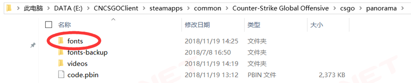 找到CSGO客户端所在文件路径,将其中的\csgo\panorama\fonts文件夹复制粘贴到其他地方备用,用于以后还原字体。
