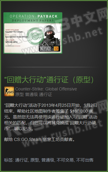 回赠大行动/Operation Payback,是CSGO首个大行动,活动于2013年4月25日开始,原定于7月31日结束,但延长至9月2日。从名称可以看出,回赠大行动目的是为了回馈广大社区地图创作者。