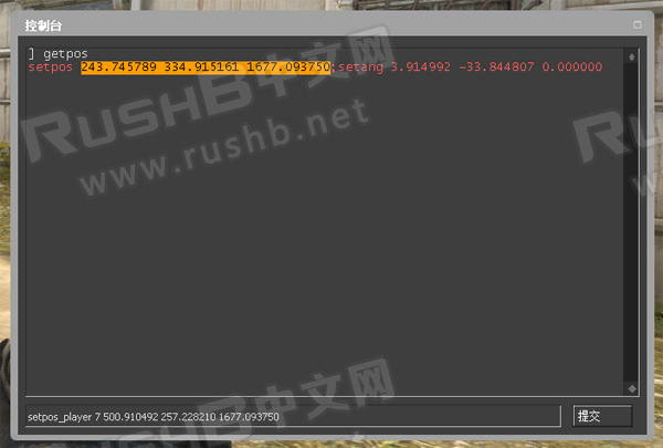获得ID后,我们便可以将指定玩家或BOT传送到指定坐标,首先用getpos获得坐标,我们只要第一个分号前的三个数字(x/y/z),将其复制。