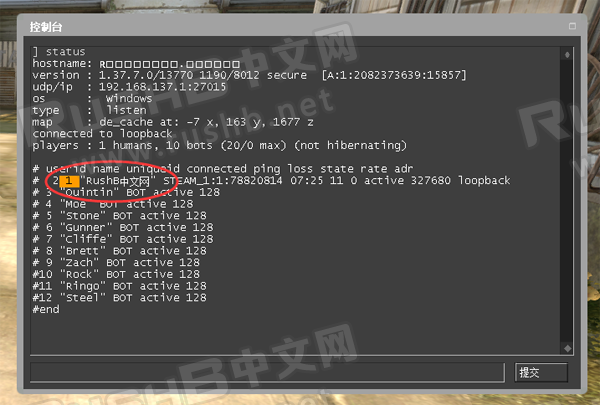 使用方法,控制台输入:status,然后会显示服务器中所有玩家列表,玩家名字前面的数字就是玩家ID,比如图中的“RushB中文网”玩家是“1”。注意,如果是BOT的话,名字前面的ID并不对应,请看下方的获取BOT ID方法。