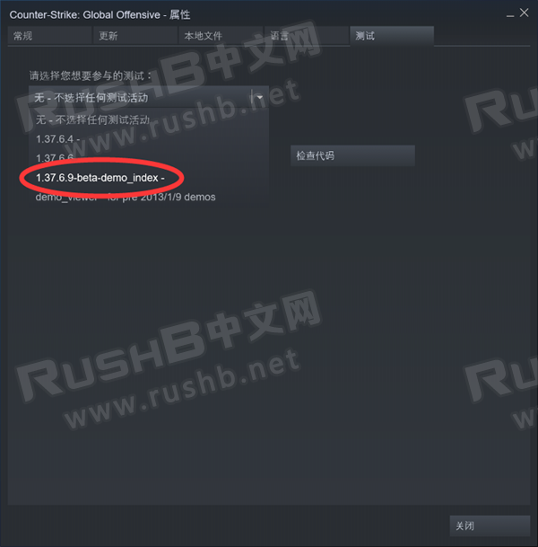 CSGO Beta/测试已提供新的分支:1.37.6.9-beta-demo_index,想要参与测试的玩家可从Steam客户端——库——CSGO右键属性,在属性窗口——测试——请选择你想要参与的测试,选择“1.37.6.9-beta-demo_index”便会自动下载测试更新。如果想要取消测试,选择回“无 – 不选择任何测试活动”即可。