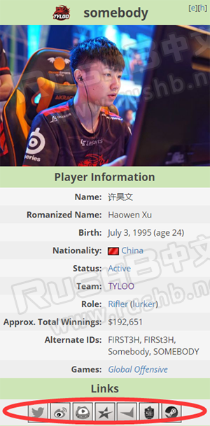 这里以Tyloo选手somebody为例,如果名称匹配的话会直接进入该职业选手的详细介绍页面,在右边栏的选手信息里的“Links”,显示的就是他的Steam账户页面、使用的社交媒体平台和直播平台、对战平台账号,点击图标即可进入查看。
