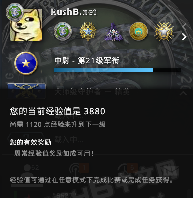 - 玩家的CS:GO个人资料军衔升级为“中尉军衔 21”(21级),可称为优先状态账号。