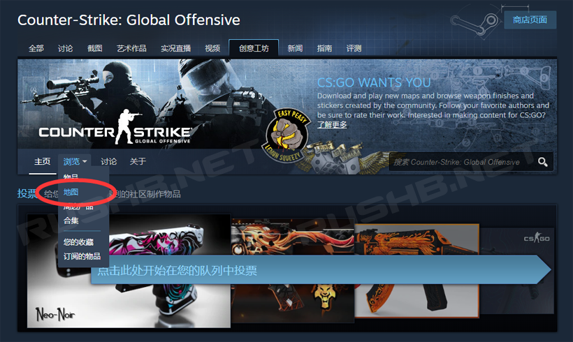 首先,我们打开Steam社区CSGO创意工坊网址: